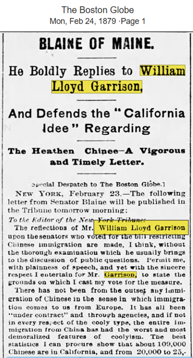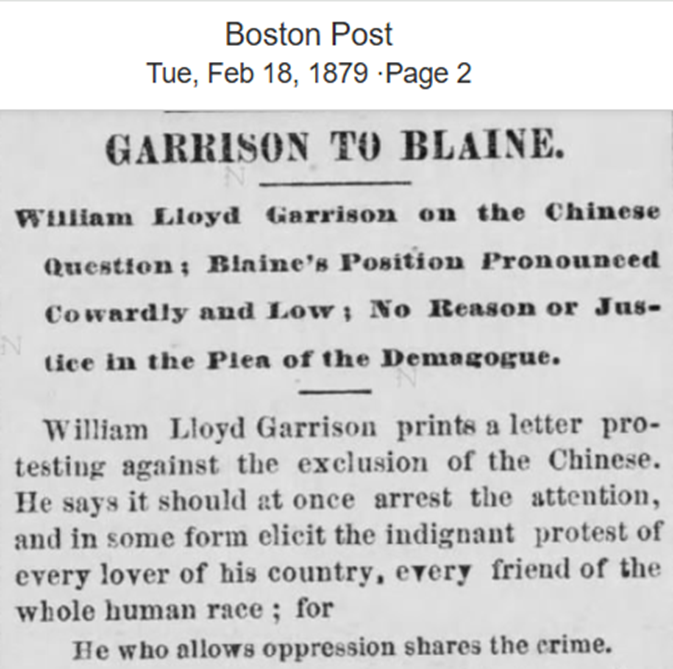 这项法案的主要推动者是缅因州的共和党参议员布莱恩(James Blaine)。1880年美国将举行总统大选, 此时布莱恩正在争取共和党内提名。布莱恩算计得很清楚:加州工会首要诉求就是“中国人滚回去”,而加州又掌握着至关重要的选举人票。所以他在各地演讲中都极力煽动排华。他声称“我们必须在白人和黄种人之间做出选择”,并进一步把中国人形容为“一群群苦力”和“在政治和社会上被排斥的贱民”。加里森是(William Lloyd Garrison,1805 –1879)是波士顿著名得废奴主义者、记者和社会改革家。尽管当时他已经年迈体弱,但语言依然犀利。针对布莱恩对华的恶毒攻击,1879年2月8日加里森迅速发表一篇措辞严厉的反驳布莱恩的文章。(我前面发表的妇女选举权文章里,伦敦开废奴大会上和被排斥得妇女代表Stanton坐在一起的就是这位。)
